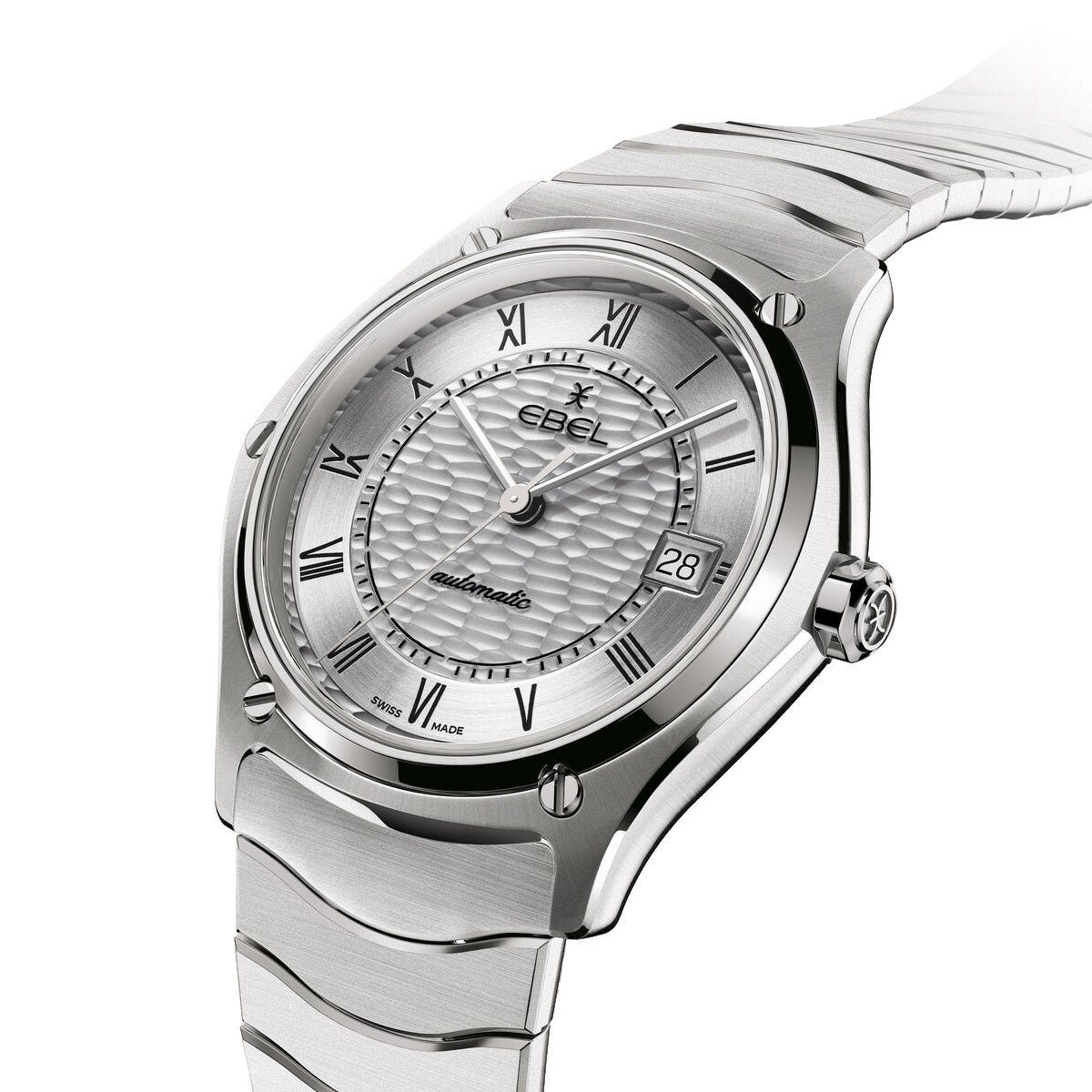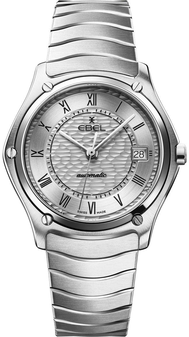 Ebel Sport Classic Watch 1216708. EBEL Sport Classic watch, stainless steel case, 37mm, white silver dial with Roman numerals engraved and painted in black, wave-textured pattern, date window at 3:00, sapphire crystal with antireflective treatment underneath, sapphire crystal case-back, stainless steel wave link bracelet with a folding clasp, Swiss automatic movement, water-resistant up to 5 bar.