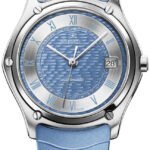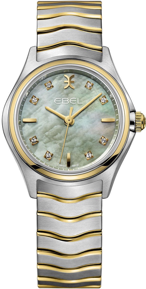 Ebel Wave Watch 1216687. Women’s EBEL Wave watch, stainless steel and 18K yellow gold case, 30mm, green-gray mother-ofpearl dial with 8 diamonds (0.052ct) and applied indexes, sapphire crystal with antireflective treatment underneath, two-tone stainless steel wave link bracelet, Swiss quartz movement, water-resistant up to 5 bar.