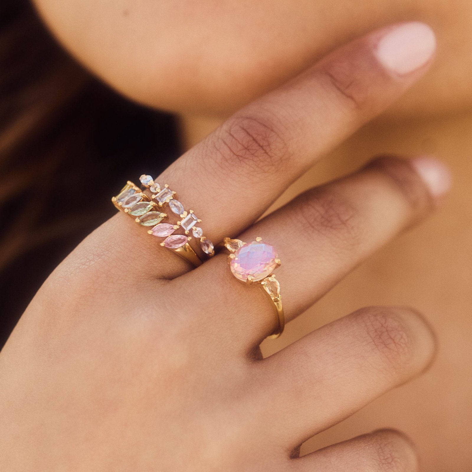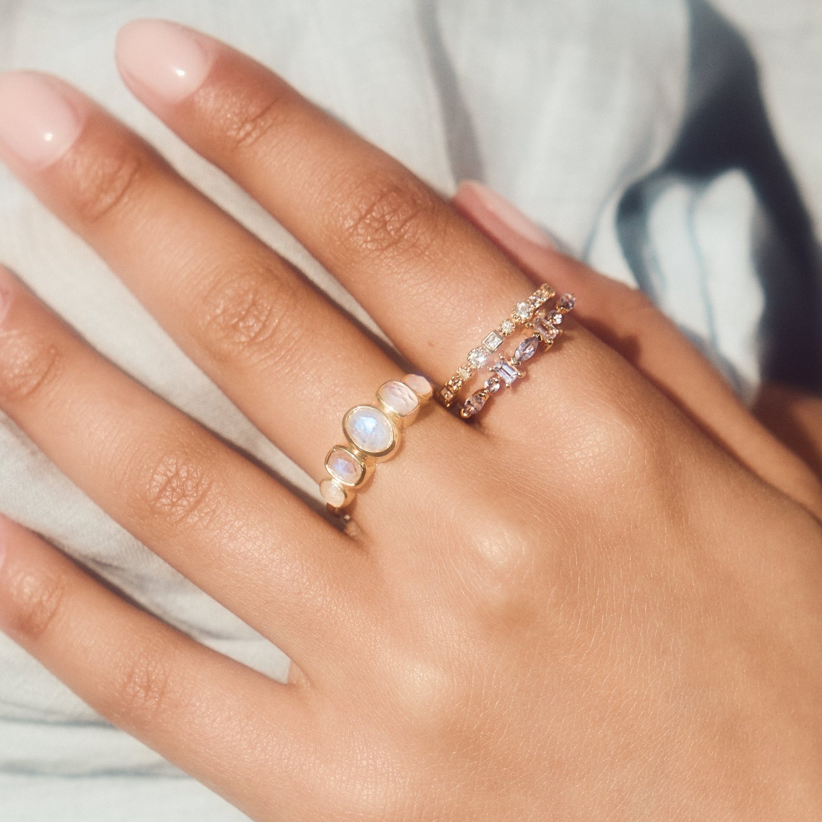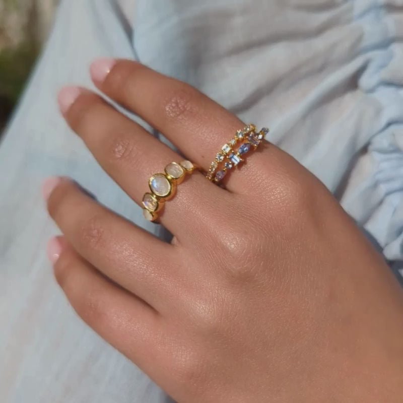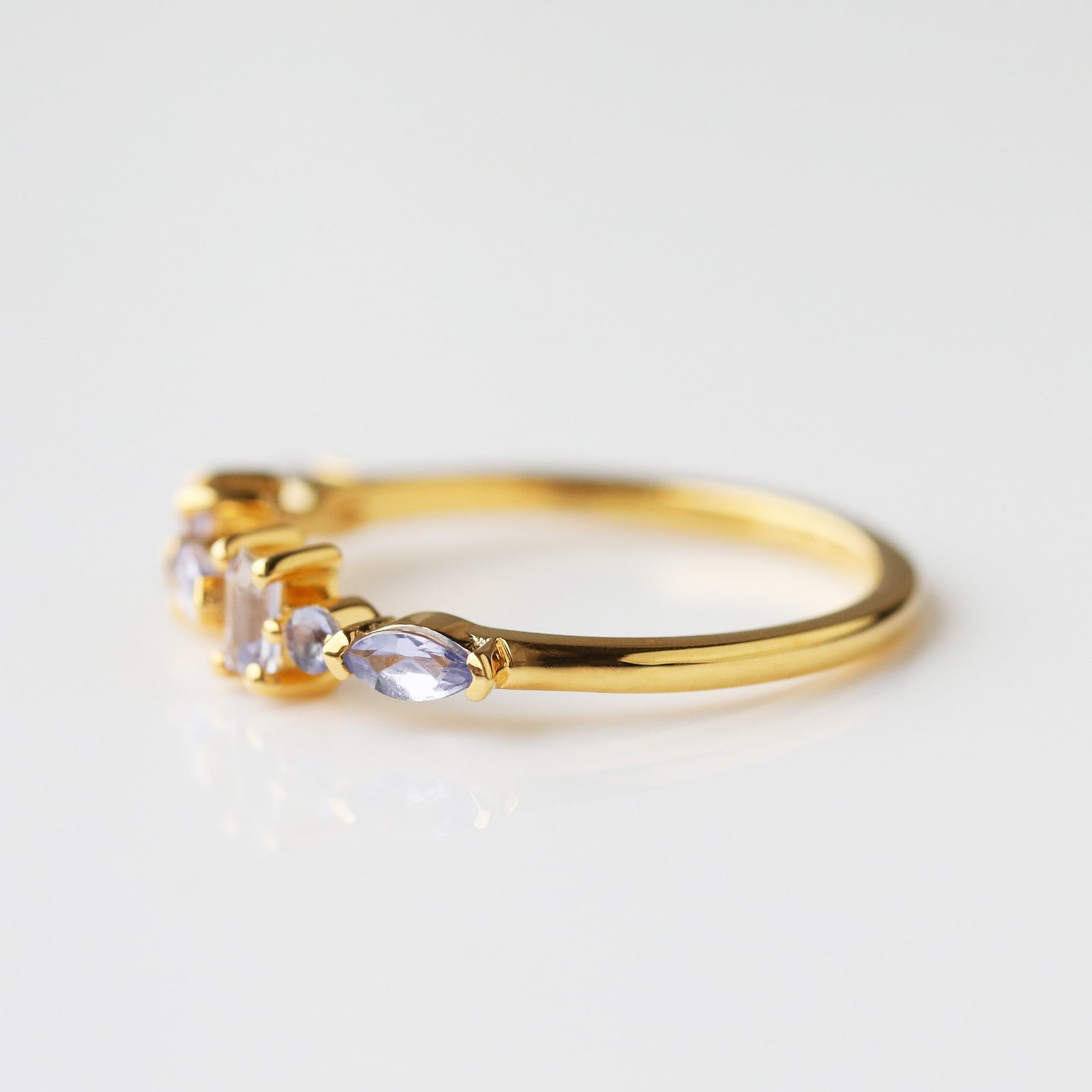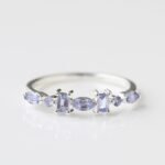 Delicate mixed shape tanzanite stones sparkle like a magical night sky in our Rae stacking ring!