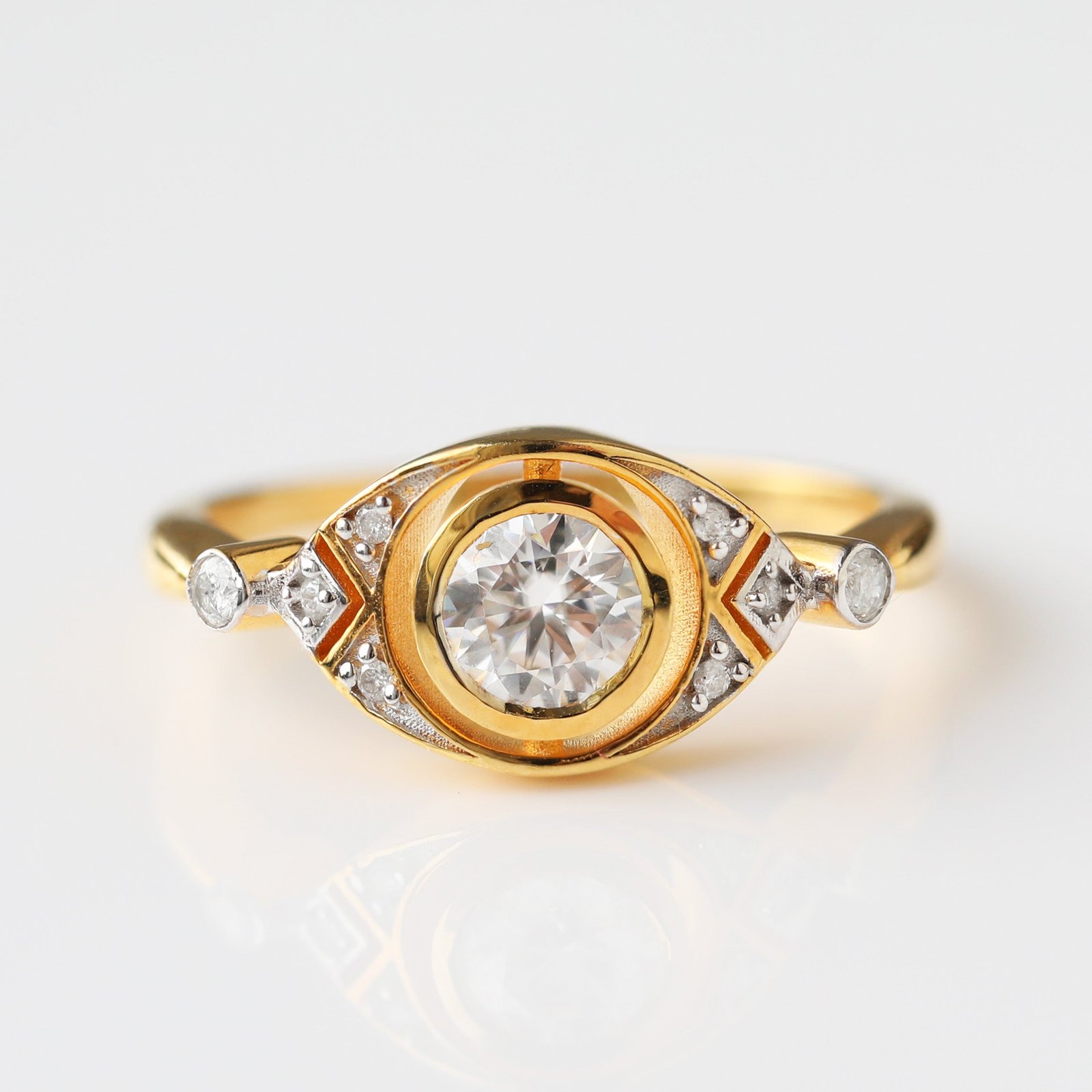 A brilliant-cut moissanite is framed by a marquise-shaped surround of pavé diamonds, geometric detailing creating an Art Deco feel. Sterling silver and 14k gold vermeil accents lend a luxurious, demi-fine air, while a slim, polished shank keeps the look contemporary.